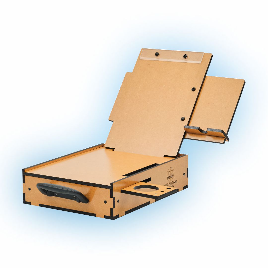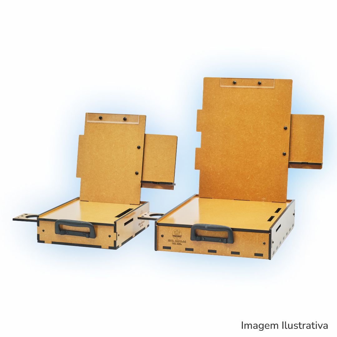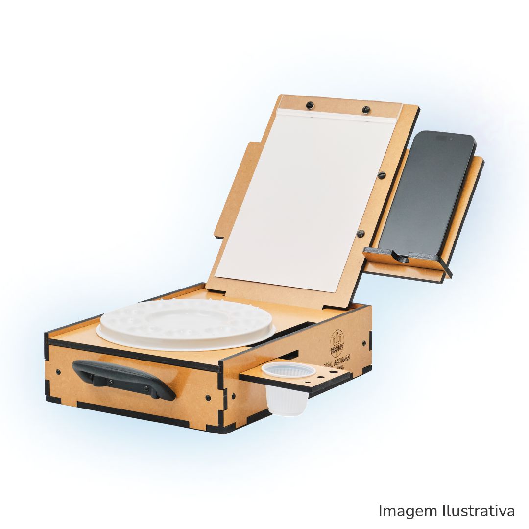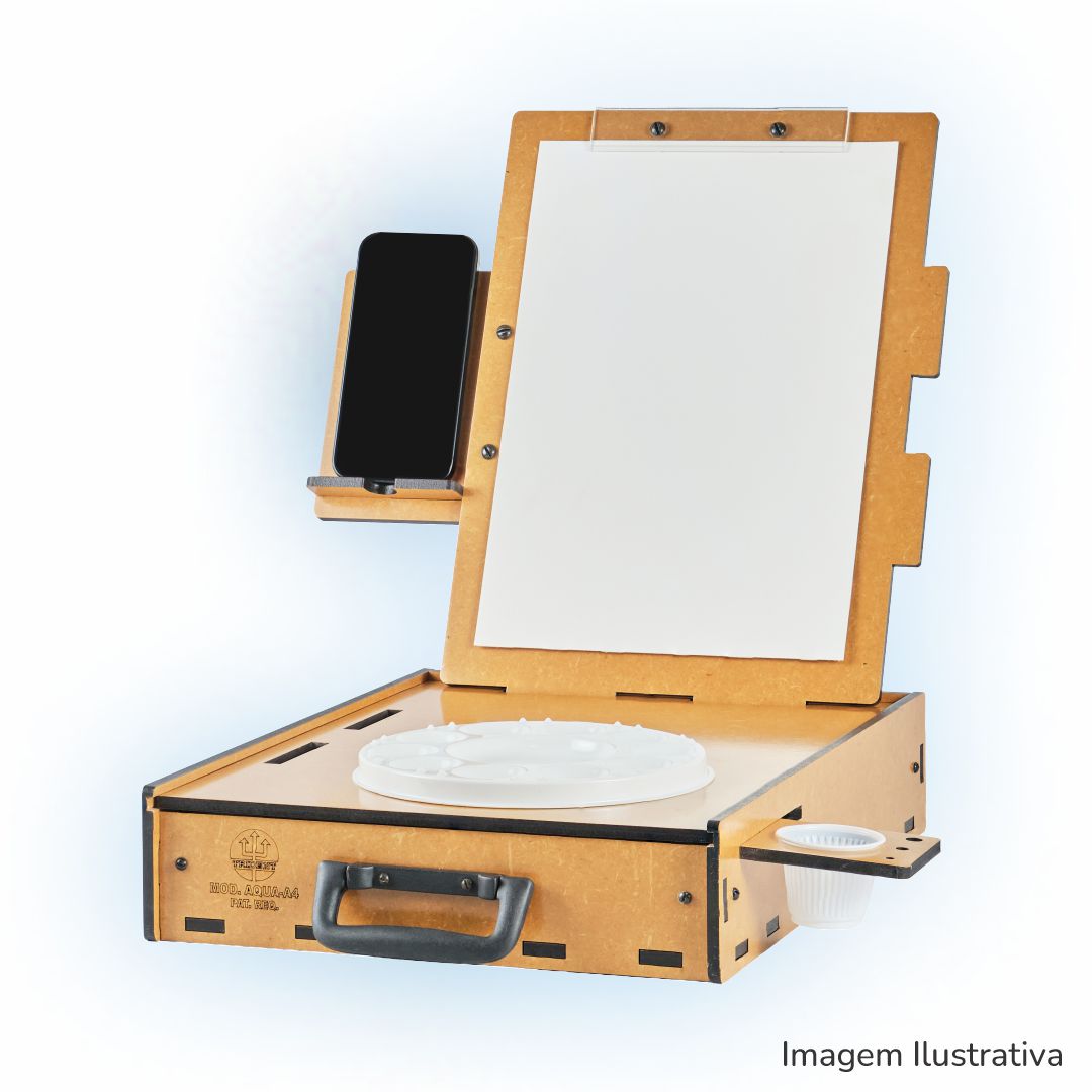 De formato anatômico, bem dimensionado, acomoda muito bem os acessórios básicos para esta técnica de pintura, conta com alça de mão para o transporte, que o torna ideal para trabalhos em casa ou no campo. Fabricado em MDF de 6 mm, com proteção contra umidade em verniz à base de poliuretano de fino acabamento. Alça de mão dobrável para transporte e posterior armazenamento. O suporte para pincéis e copos, e o porta-celular, podem ser posicionados do lado esquerdo ou direito do usuário de acordo com sua preferência. A prancheta permite o uso nas posições Retrato ou Paisagem! O estojo pode ser posicionado do lado esquerdo ou direito do usuário de acordo com sua preferência. Prendedor de papel em acrílico!