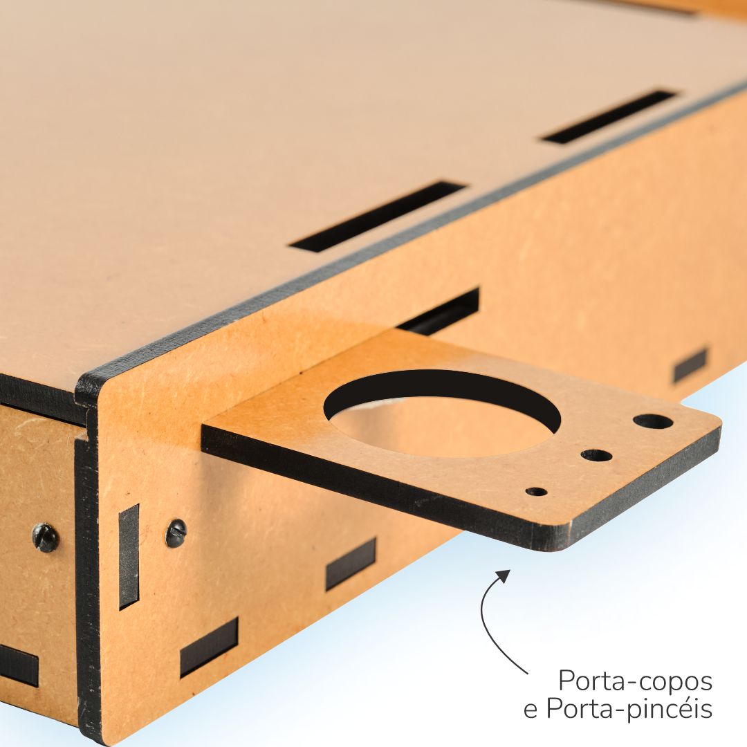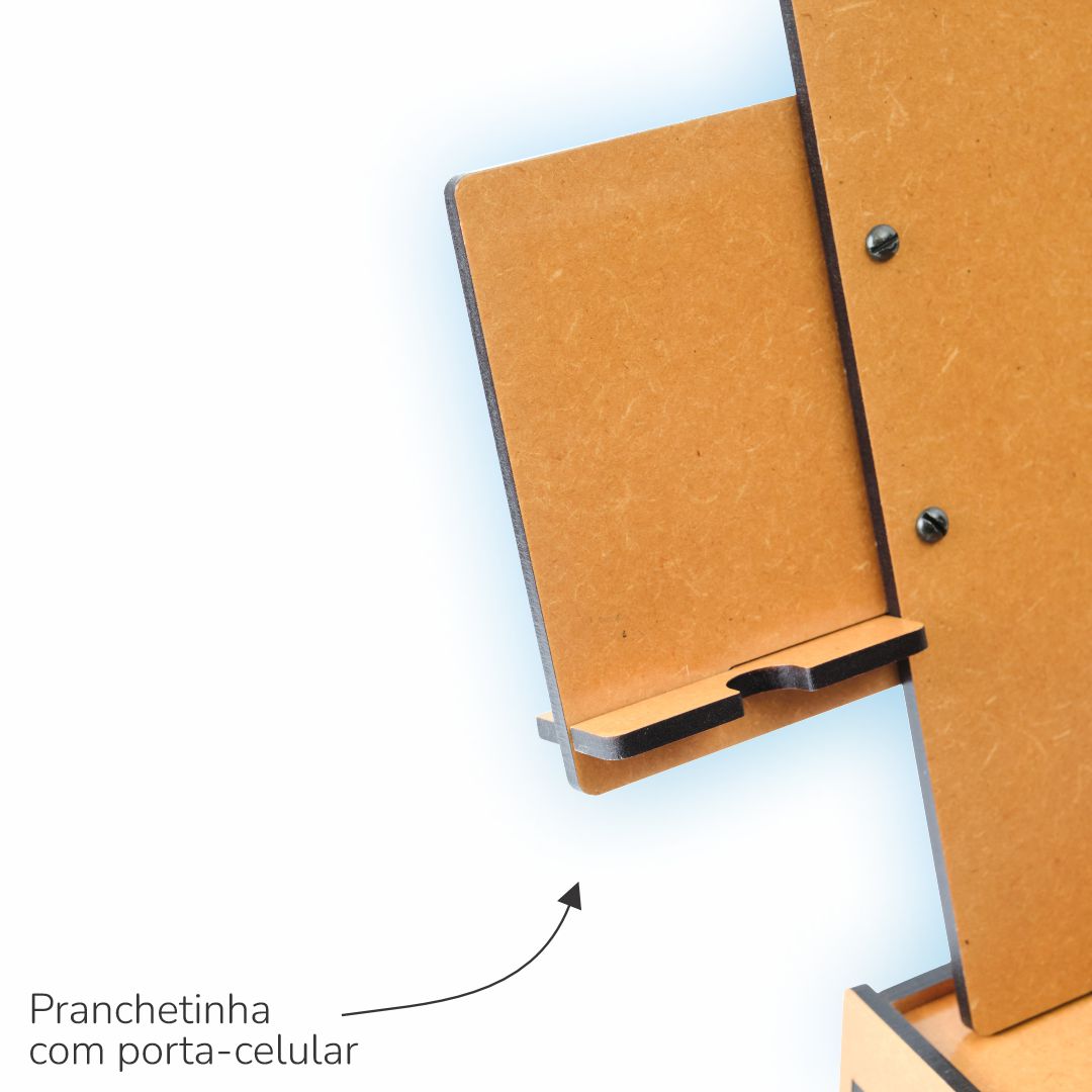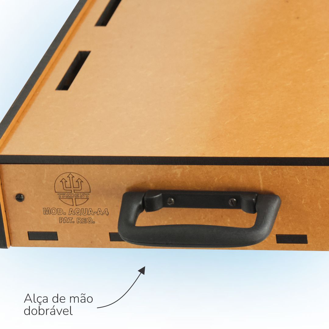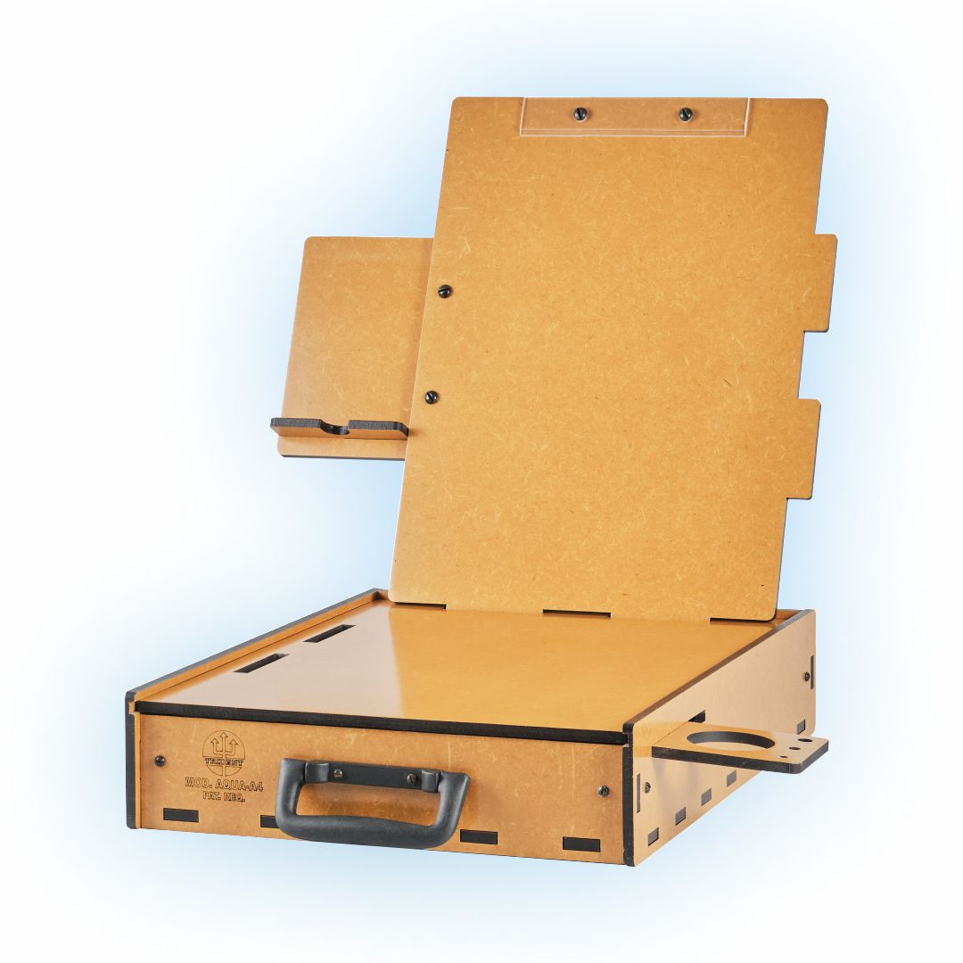 De formato anatômico, bem dimensionado, acomoda muito bem os acessórios básicos para esta técnica de pintura, conta com alça de mão para o transporte, que o torna ideal para trabalhos em casa ou no campo. Fabricado em MDF de 6 mm, com proteção contra umidade em verniz à base de poliuretano de fino acabamento. Alça de mão dobrável para transporte e posterior armazenamento. O suporte para pincéis e copos, e o porta-celular, podem ser posicionados do lado esquerdo ou direito do usuário de acordo com sua preferência. A prancheta permite o uso nas posições Retrato ou Paisagem! O estojo pode ser posicionado do lado esquerdo ou direito do usuário de acordo com sua preferência. Prendedor de papel em acrílico!