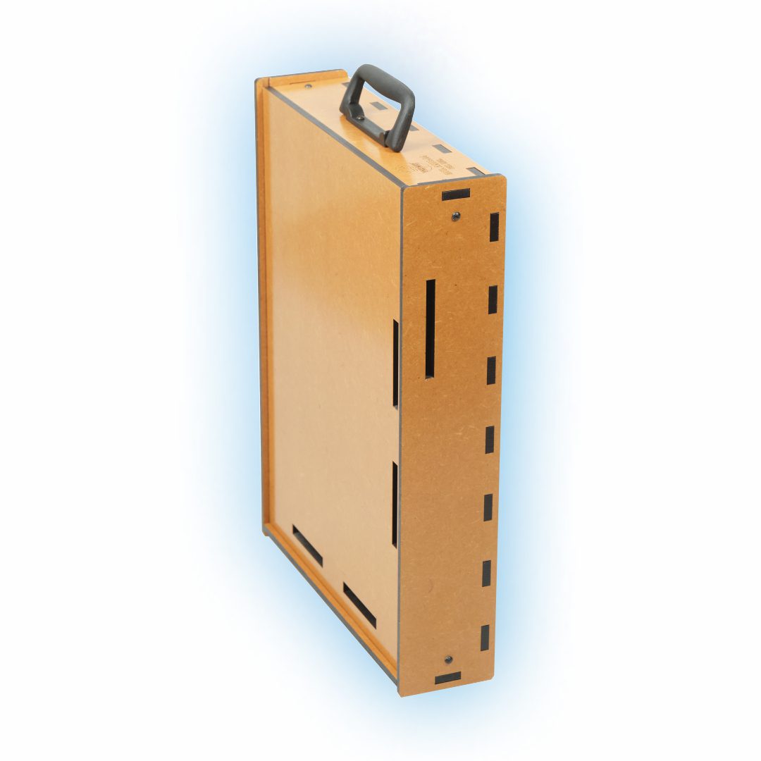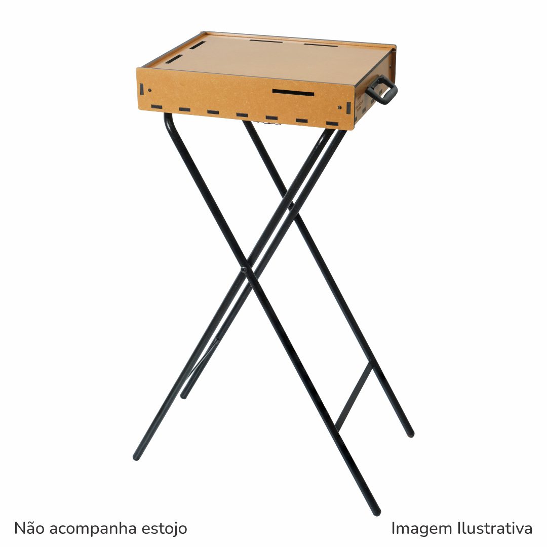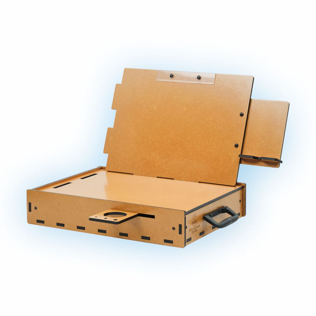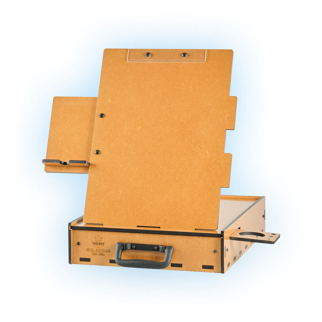 De formato anatômico, bem dimensionado, acomoda muito bem os acessórios básicos para esta técnica de pintura, conta com alça de mão para o transporte, que o torna ideal para trabalhos em casa ou no campo. Fabricado em MDF de 6 mm, com proteção contra umidade em verniz à base de poliuretano de fino acabamento. Alça de mão dobrável para transporte e posterior armazenamento. O suporte para pincéis e copos, e o porta-celular, podem ser posicionados do lado esquerdo ou direito do usuário de acordo com sua preferência. A prancheta permite o uso nas posições Retrato ou Paisagem! O estojo pode ser posicionado do lado esquerdo ou direito do usuário de acordo com sua preferência. Prendedor de papel em acrílico!